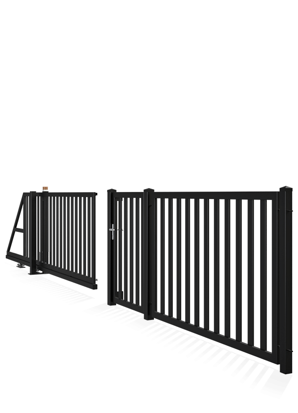 Einfache, Minimalistische und klassische Formen. Die Fu?llung der Zaunpaneele und Tore besteht aus vertikalen Elementen. Zaunsystem: Eingangstor, Schiebetor, Segment Masse der Pfosten: 80x80; 100x100 (Eingangs+Einfahrtstor) Rahmenprole: 80x40 Fu?llprole: 80x20