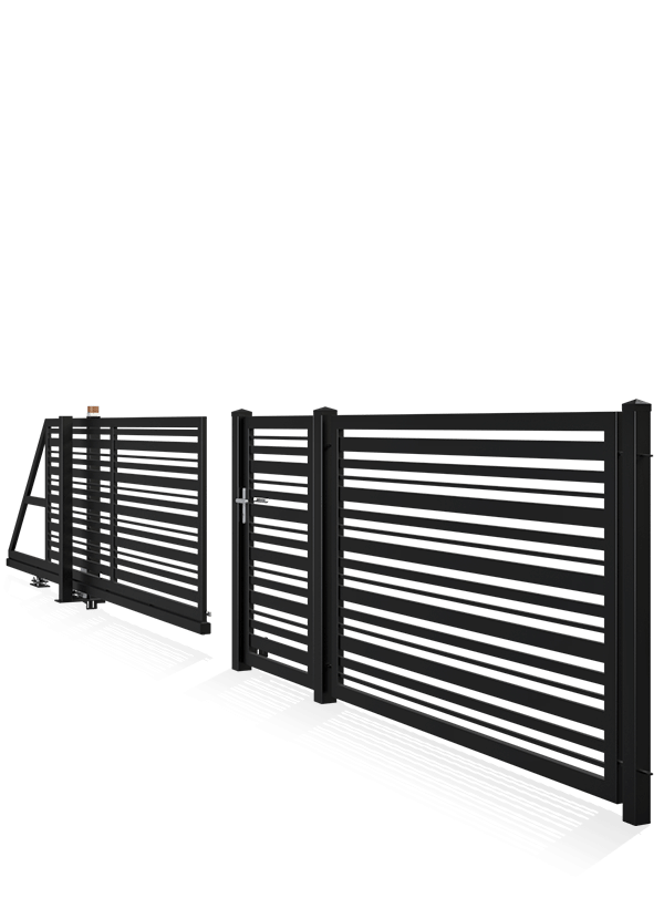 Moderne Lösungen fu?r modernes Bauen. Die Felder sind aus horizontalen Elementen aufgebaut. Zaunsystem: Eingangstor, Schiebetor, Segment Masse der Pfosten: 80x80; 100x100 (Eingangs+Einfahrtstor) Rahmenprole: 80x40 Fu?llprole: 80x20; 50x20; 20x20