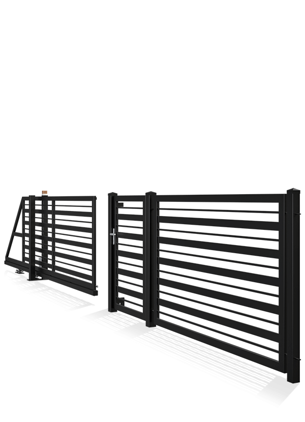 Moderne Lösungen fu?r modernes Bauen. Die Felder sind aus horizontalen Elementen aufgebaut. Zaunsystem: Eingangstor, Schiebetor, Segment Masse der Pfosten: 80x80; 100x100 (Eingangs+Einfahrtstor) Rahmenprole: 80x40 Fu?llprole: 80x20; 20x20